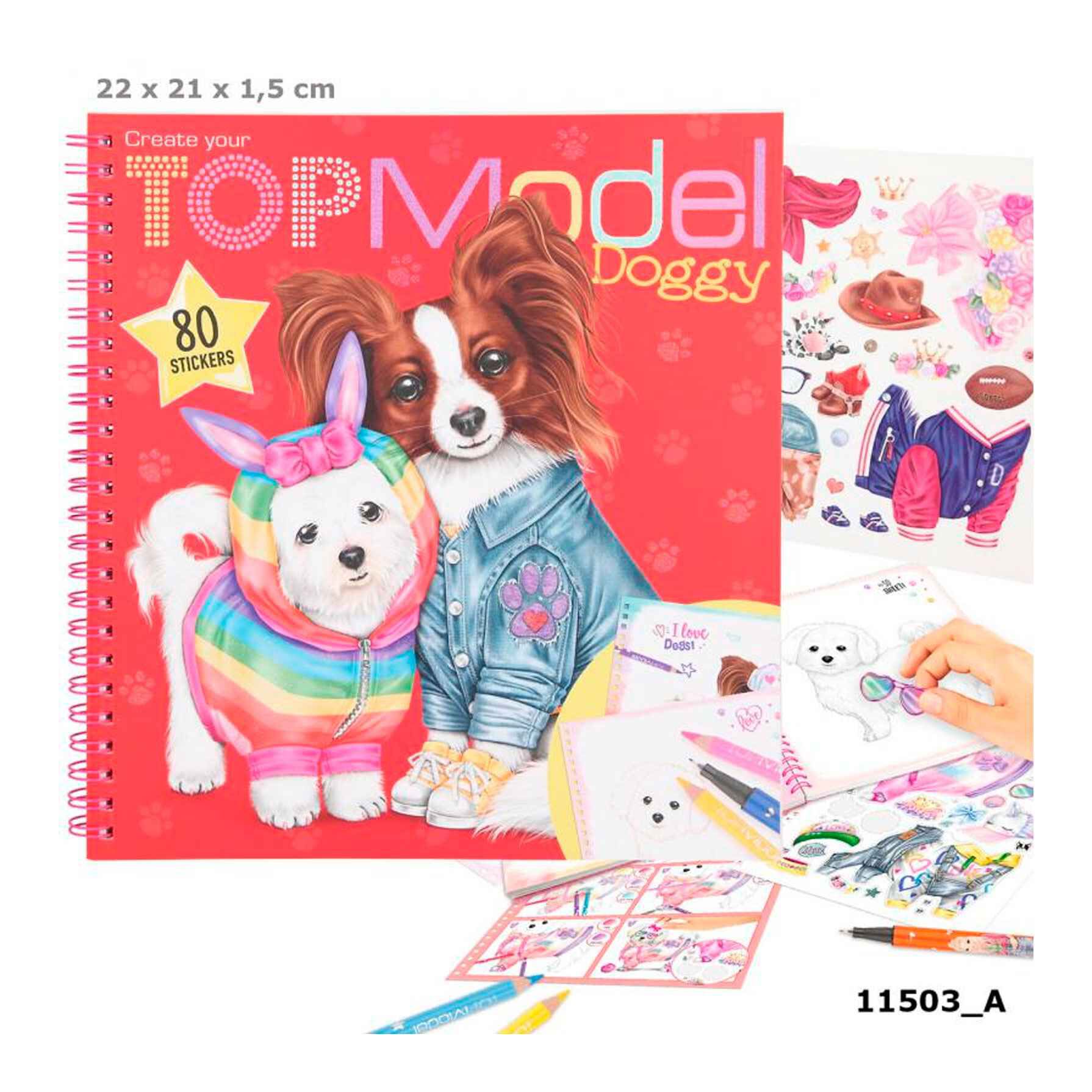 ¡Guau, guau! El cuaderno para dibujar y colorear Doggy de TOPModel encuadernado en gusanillo tiene más de 40 imágenes de monísimos perritos esperando a que las colorees y les pongas complementos. Para ello incluye 3 hojas de pegatinas. Advertencias: Advertencia! Peligro de atragantamiento! piezas pequeñas!