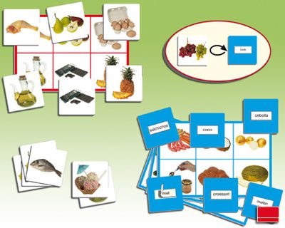 Loto de 72 alimentos distintos para trabajar la asociación de los mismo de dos formas: imagen con imagen o imagen con palabra (nombre del alimento). Permite aplirar el vocabulario. Pueden jugar hasta 12 niños. Juego compuesto de 12 láminas (cada lámina contiene la imagen de 6 alimentos diferentes) + 72 fichas para cmpletar las láminas (anverso: imagen del alimento;reverso: hueco para poner el nombre del alimento) + 72 pegatinas con el nombre de los alimentos para pegar en el reverso de la ficha de cada alimento según corresponde. Incluye Guía pedagógica.