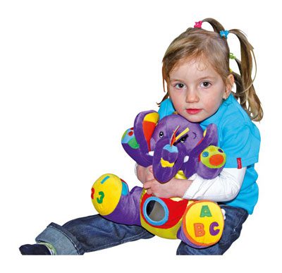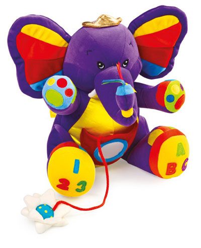 Elefante de peluche blando, con orejas crujientes y una flor sonora en la barriguita. Con espejo y distintos materiales estimulantes. Aprox. 26×30 cm.