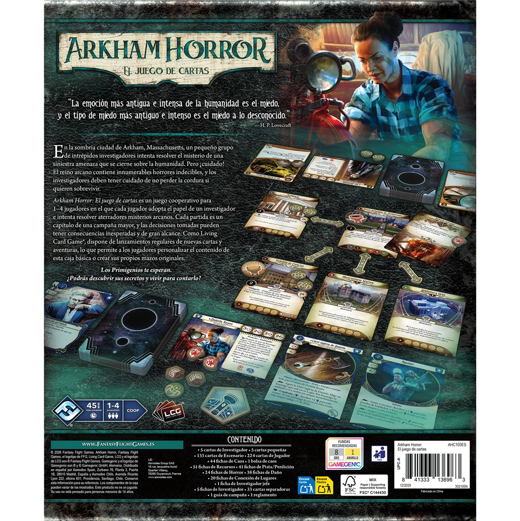 Arkham Horror: El juego de cartas es un juego cooperativo para 14 jugadores en el que cada jugador adopta el papel de un investigador e intenta resolver aterradores misterios arcanos. Cada partida es un capítulo de una campaña mayor, y las decisiones tomadas pueden tener consecuencias inesperadas y de gran alcance. Como Living Card Game®, dispone de lanzamientos regulares de nuevas cartas y aventuras, lo que permite a los jugadores personalizar el contenido de esta caja básica o crear sus propios mazos originales.