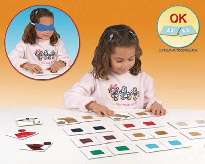 Juego sensorial para desarrollar el sentido del tacto a partir de la diferenciación de varios tactos y su asociación a diversas fotografías. 16 fichas de tactos (8 parejas) + 16 fichas con fotografías que representan los diferentes tactos + 2 antifaces. Sistema autocorrector en el reverso. Guía pedagógica y maletín contenedor.